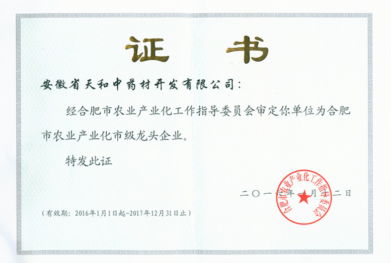 2015年,在公司群体员工的共同努力下,我司加快产业发展,加强自主创新能力,在外贸业务及基地种植方面皆取得优异成绩。经市农业产业化工作指导委员会审定,授予我司“合肥市农业产业化市级龙头企业”称号。