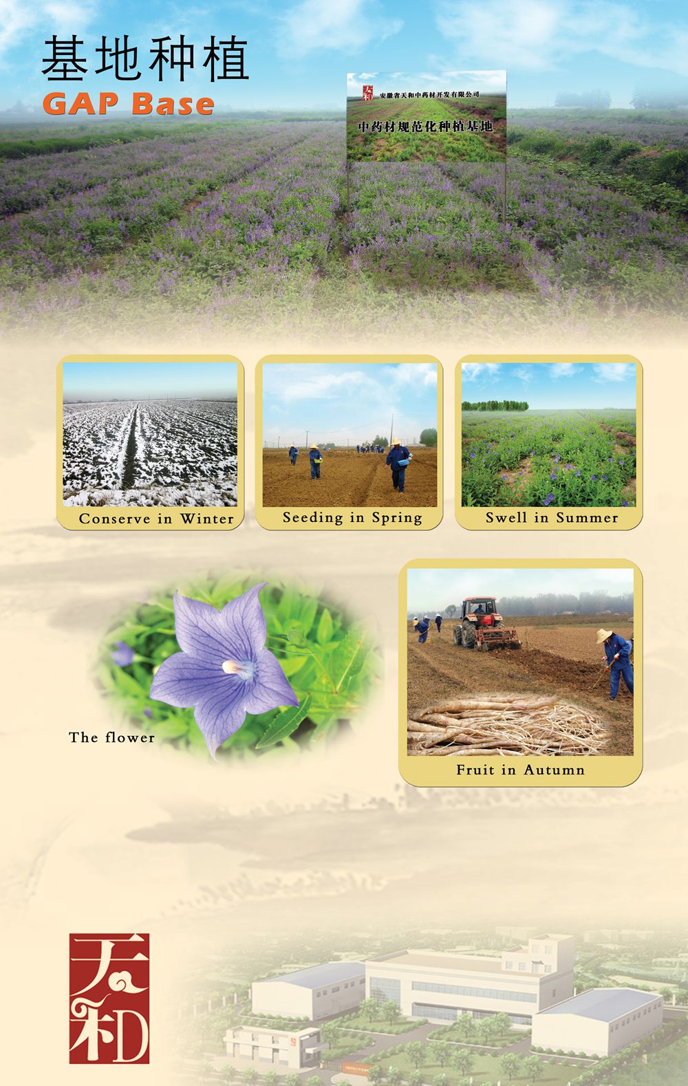 Anhui Tienho Herbal Source Company(TIENHO) base is near reservoir, Longmen temple, Gucheng village,Taolou Township, Changfeng County, Hefei city and covers about 1000 mu of land. Manily planting white peny root, platycodon, Danshen, forsythia, mint and other herbs. From good seeds breeding to scientific and standardized cultivation and the quality control of growing period, to realize the development goals of health, green and safe traditional herbs.